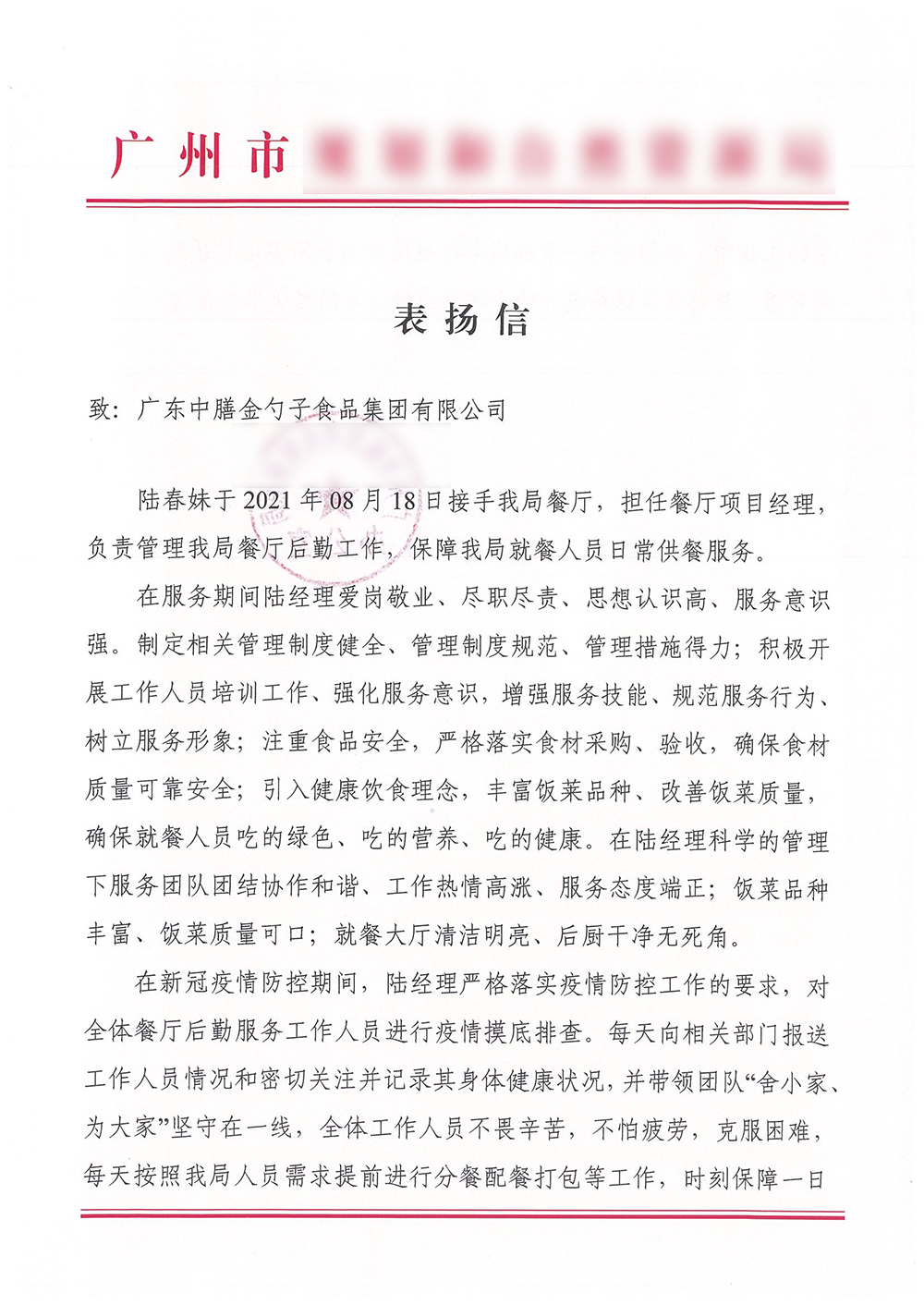 12月22日,一封來自某醫院職工食堂的表揚信,其中寫到“在疫情形勢嚴峻的情況下,能根據我方的實際情況制定合適的服務方案”,“我方對廣東中膳金勺子食品集團的餐飲服務各方面綜合評價為優秀!”