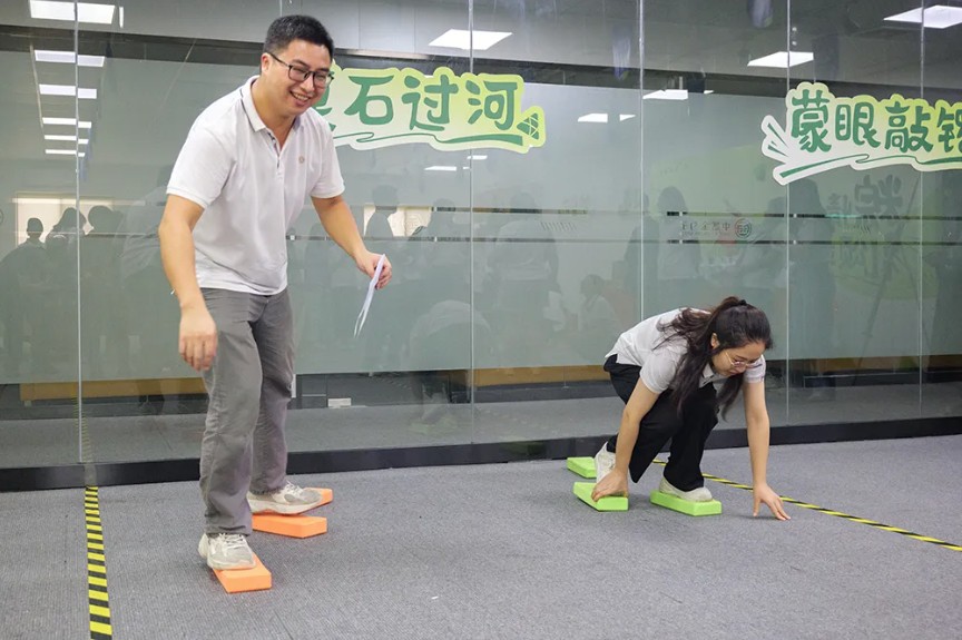 《摸石頭過河》游戲則是一場趣味橫生的競賽。員工們共同跨越障礙,到達終點,感受到了團隊協作的重要性。